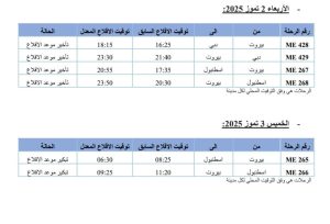 أعلنت شركـة طيران الشرق الأوسط – الخطوط الجوية اللبنانية عن تعديل جدول رحلاتها لأيام 2 و3 و4 تموز 2025 لاسباب تشغيلية، حيث سيتم: